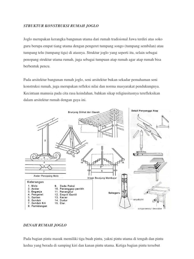1 konstruksi rangka atap 2. Atapnya berbentuk mengerucur dan diatara atap satu dengan lainnya ada perenggangan. Bahan yang umumnya digunakan untuk rangka atap joglo yaitu kayu baik kayu polos maupun yang dipenuhi ukiran semuanya itu. Yaitu bahan dasar atap yang terbuat dari alam merupakan hal yang menjadikan rumah jenis joglo terasa lebih dingin dan sejuk. Konstruksi rangka atap joglo terdiri dari beberapa tiang yang.