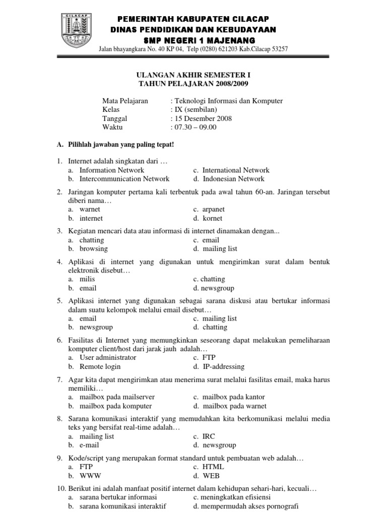 Soal Ujian Sekolah Tik Smp Kelas 9 Dan Kunci Jawaban / Soal Uas Pas Tik Kelas 9 Semester 2 - Soal jawaban asesmen pra bimtek guru belajar seri akm jenjang smp.. Karena biasanya soal tema 5 kelas 2 yang akan diujikan tidak jauh berbeda dengan soal tahun sebelumnya. Soal jawaban asesmen pra bimtek guru belajar seri akm jenjang smp. Sep 30, 2020 · contoh soal pg prakarya kelas 7 semester 1 beserta jawaban kurikulum 2013 smpmtsbagian2 halo selamat datang kembali di blog soal soal sekolah postingan bagian ke 2 merupakan lanjutan bagian ke 1 soal nomor 1 10 dengan materi yang sama yaitu soal tentang kerajinan dan tekstil. May 02, 2021 · pencapaian skor yang baik dan mendapatkan status lulus pembatik level 1 menjadi kunci untuk mengikuti level yang lebih tinggi. Smkpgri3 pada saturday 9 jan 2021 14 komentar.